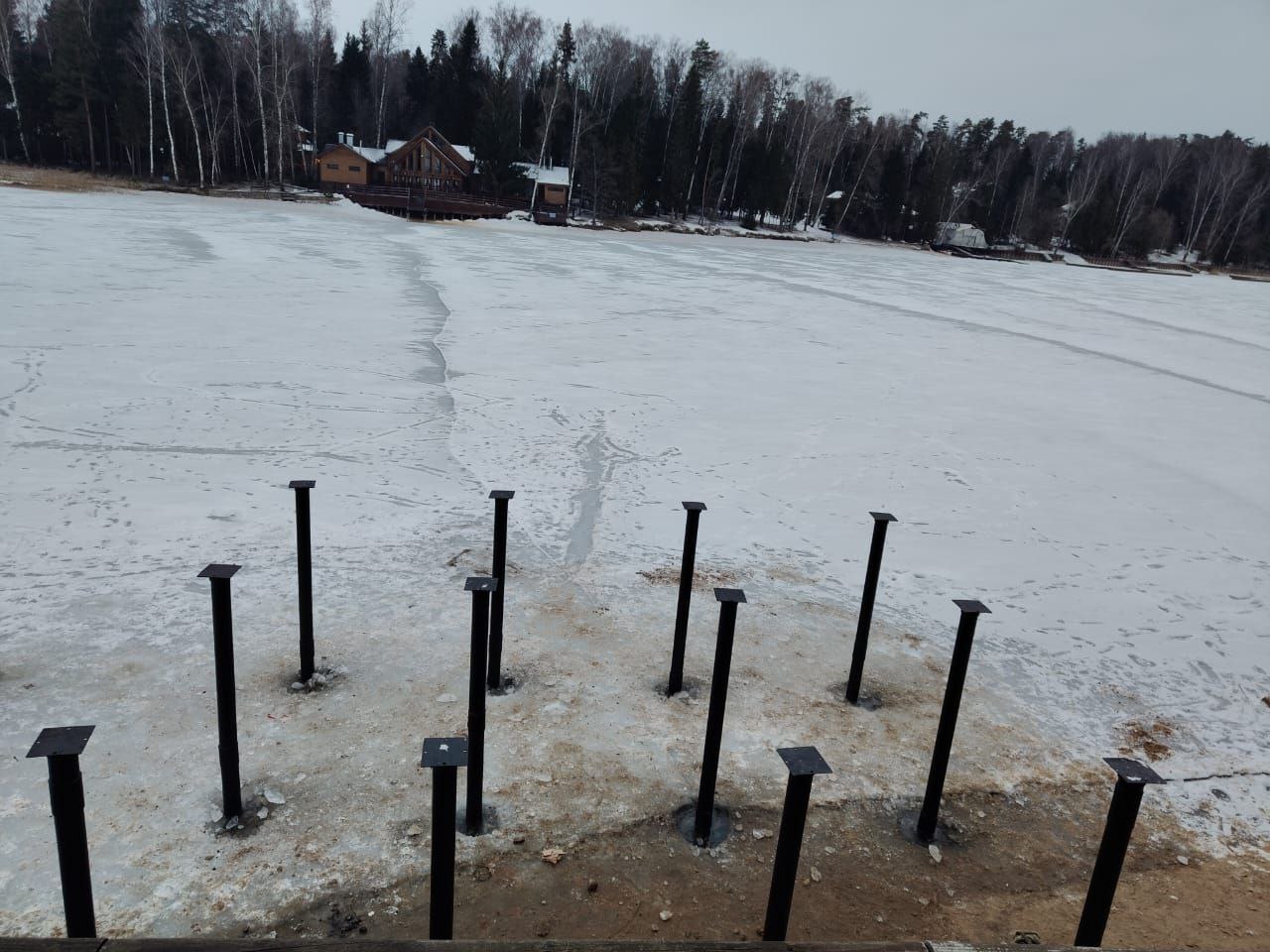 Выбор времени года для проведения работ был неслучайным. Зима является наиболее благоприятным периодом для возведения подобных сооружений на воде. Благодаря крепкому ледяному покрову наши специалисты получили устойчивую площадку для работы, что позволило избежать использования дорогостоящих понтонов или специализированной плавучей техники. Работа со льда дает возможность максимально точно позиционировать каждую опору и контролировать вертикаль при закручивании, обеспечивая идеальную геометрию будущего строения.