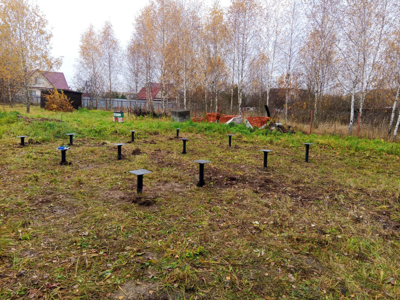 2. Монтаж свай: Далее последовало вкручивание всех двенадцати винтовых свай в грунт. Монтаж проводился с применением специализированного оборудования, что гарантирует правильное и плотное вхождение сваи в несущие слои грунта.